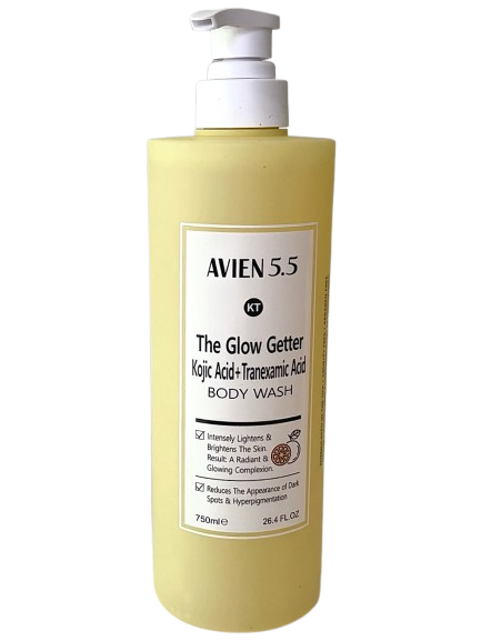 Avien 5.5 The GlowvGetter Body Wash is infused with two superb brightening ingredients, Kojic Acid and Tranexamic Acid, that works in synergy to intensely brighten the skin for a more healthy and radiant glow.