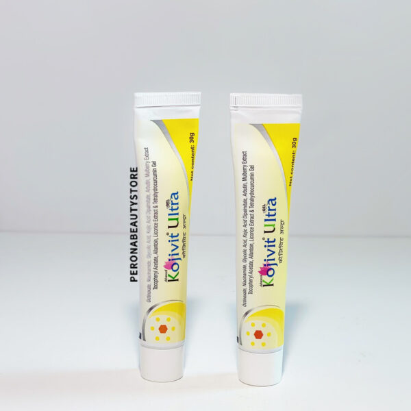 LpGKojivit Ultra Gel contains Allantoin, Arbutin, Glycolic acid, Kojic acid, Liquorice extract, Mulberry extract, Octinoxate, Niacinamide, Tetrahydrocurcuminoids, and Tocopherol acetate as active ingredients. Kojivit Ultra helps brighten the skin and tackles hyperpigmentation.L/pG