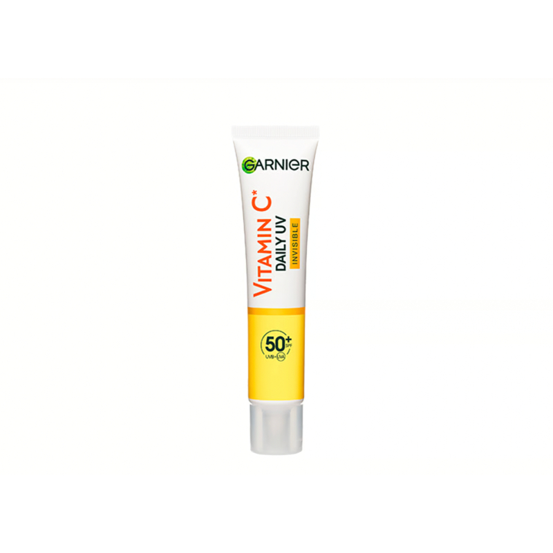 Garnier Skin Active Vitamin C Daily UV Brightening Fluid Invisible SPF50+ 40ml hydrates, protects, and enhances skin glow while fighting dark spots.